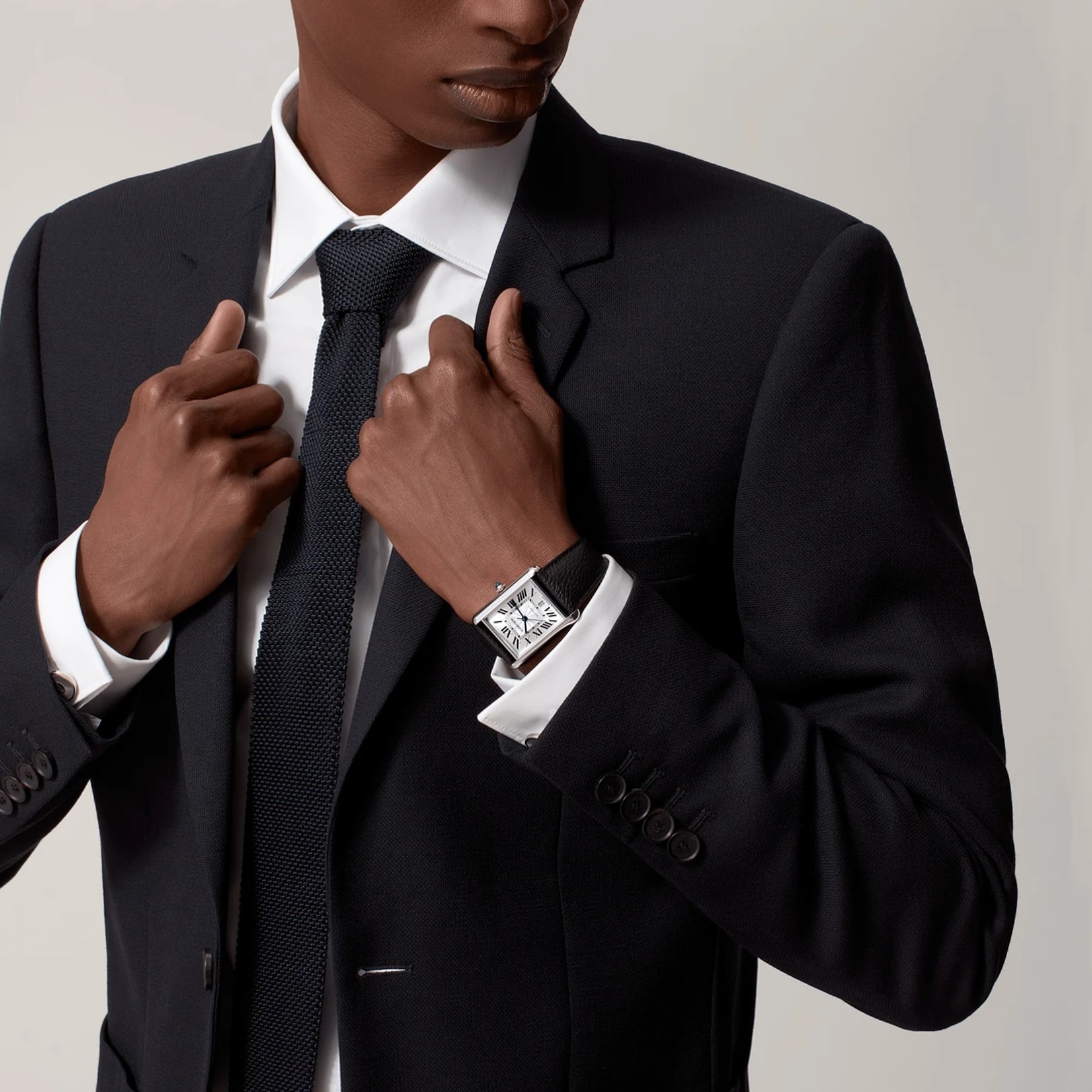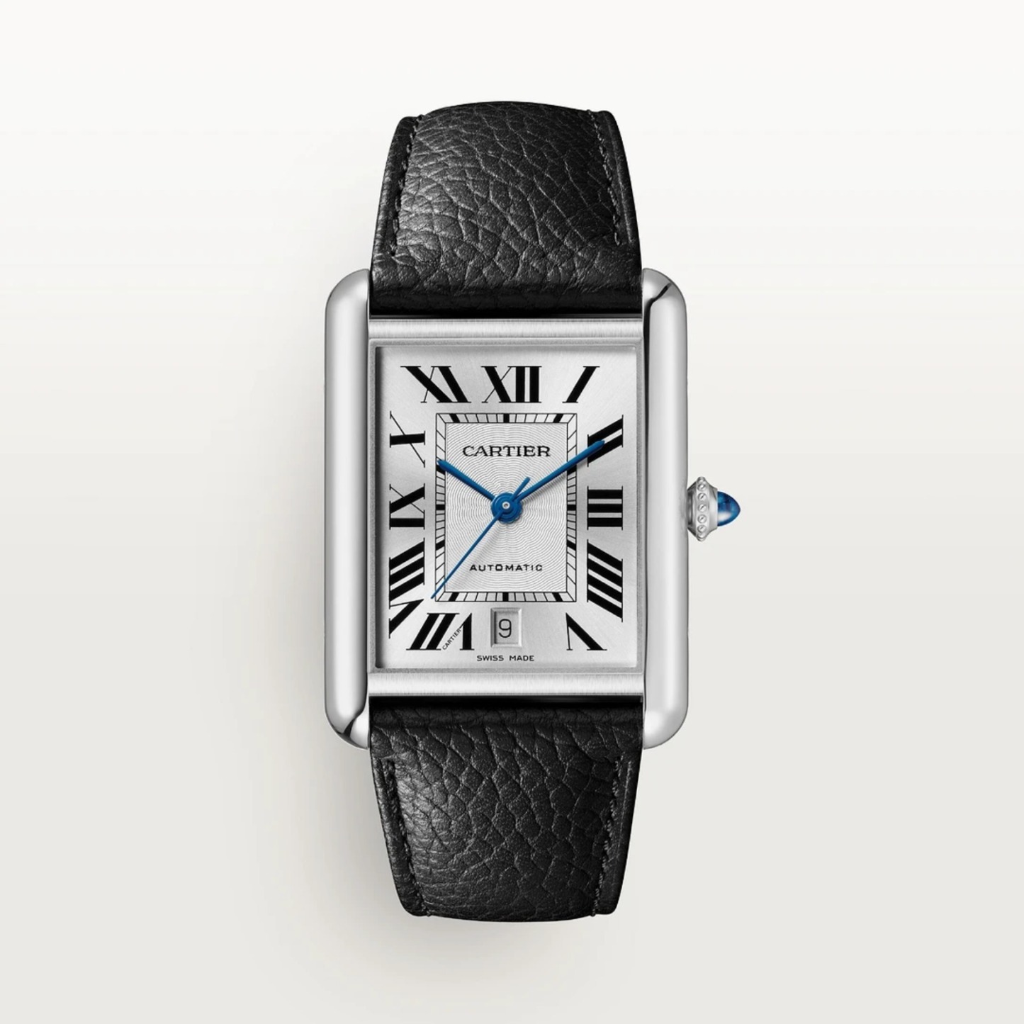 タンク マスト ウォッチ、XLM、キャリバー 1847 MC 自動巻きメカニカルムーブメント。スティール製ケース、パール状の飾り付きリューズにカボションシェイプ シンセティック スピネル、シルバーのフランケダイアル、ブルースティール製剣型針、グレイン仕上げブラックカーフスキン ストラップ、交換可能スティール製デプロワイヤントバックル、6時位置にカレンダー表示。ケースサイズ:41 mm x 31 mm、厚さ:8.4 mm。日常生活防水。