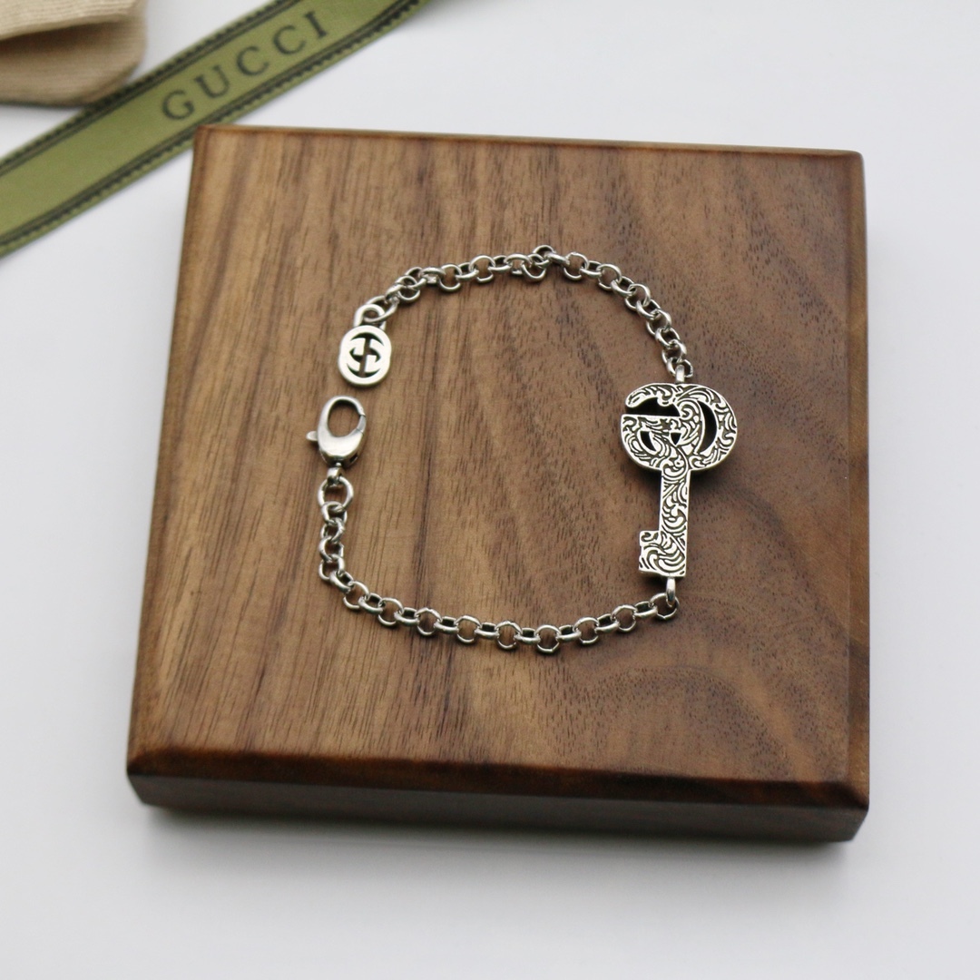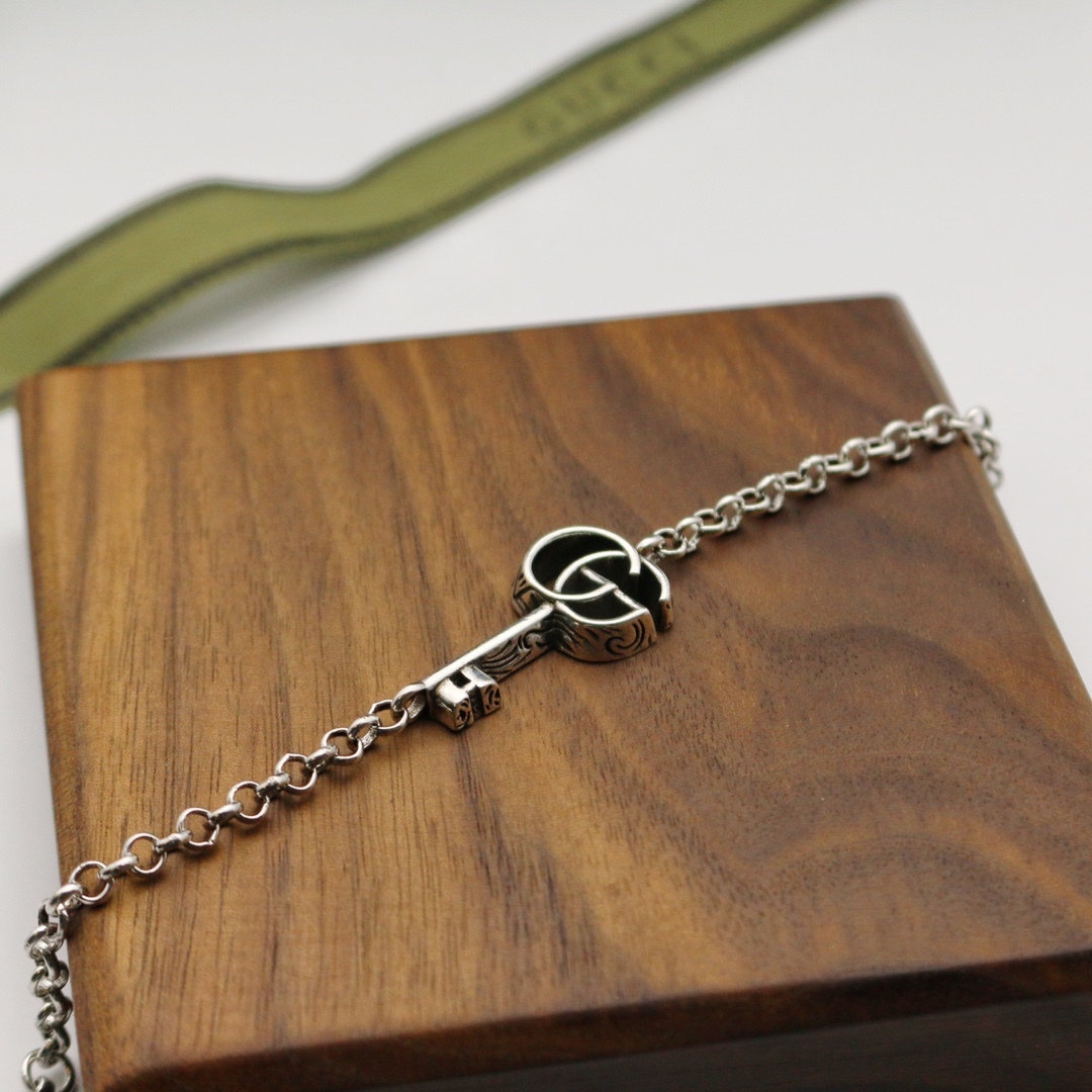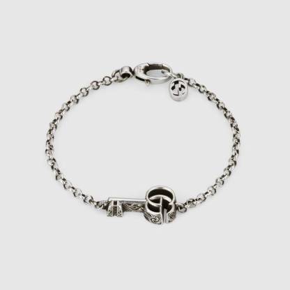 エイジング フィニッシュを施したスターリングシルバー ブレスレット。グッチを代表するエレメント、ダブルGをデザインしたキーをチャームとしてあしらいました。卓越したクラフトマンシップと繊細なデザインでブランドをさりげなく表現するグッチのシルバージュエリー コレクションは、コンテンポラリーからクラシックまでさまざまなアイテムを展開しています。